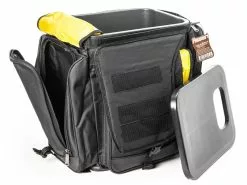 Ytterdelen er produsert i kraftig stoff, med gummiert underdel. Stor sidelomme på langsiden. Lommer med glidelås i begge ender. Solid bæresele.