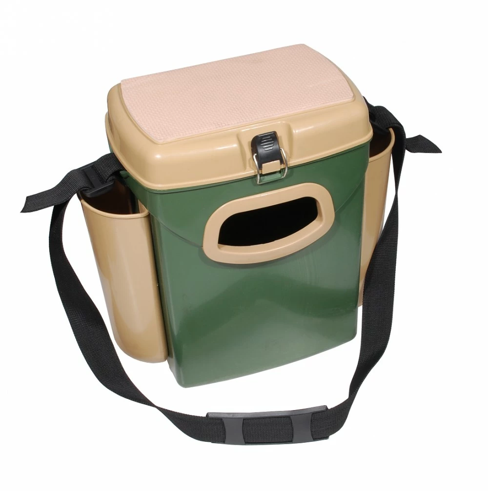Wiggler isfiskedunk. Innebygd sitteplate med foam i lokkets overside. Lokkets underside har to oppbevaringsrom. Hull for innkast av fisk. Innsats for fastsetting av plastikkposeog lokk for å gjøre kassen tett under transport. To holdere/oppbevaringsbokser på utsiden for oppbevaring av f.eks. pilkestikke, isøse, huggkrok etc.